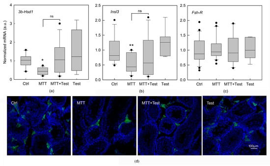 Then, we examined the effects of MTT on the expression levels of 3β-Hsd1, Insl3, and Fsh-R. FSH is required for SC proliferation, maturation, and synthesis of specific SC proteins. It is also important at the beginning of the first wave of spermatogenesis [12]. The expression of mRNA from Fsh-R was unaffected by treatment, proving that SCs are not the main target of the drug and that the alteration of spermatogenesis is unrelated to SC damage (Figure 3c).