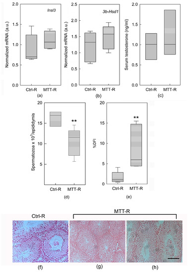 We observed that specific genes for the LCs Insl3 and 3b-Hsd1 were comparable in Ctrl-R and MTT-R mice (Figure 5a,b), as well as testosterone levels (Figure 5c). However, the number of spermatozoa remained statistically lower in MTT-R mice compared to Ctrl-R mice (p < 0.01; Figure 5d). In addition, cells with abnormal chromatin structures, calculated by the evaluation of the parameter DNA fragmentation index (%DFI), were significantly more common in MTT-R mice (p < 0.01; Figure 5e). Morphological evaluation of seminiferous tubules in the MTT-R mice confirmed these latter data. Although the morphology of the seminiferous tubules was partially recovered, we observed a smaller number of spermatozoa in the tubule sections (Figure 5f–h).
