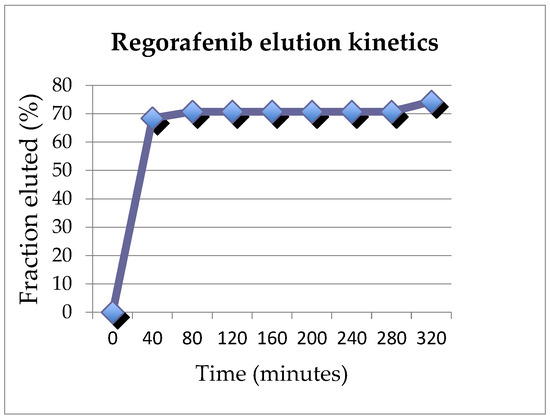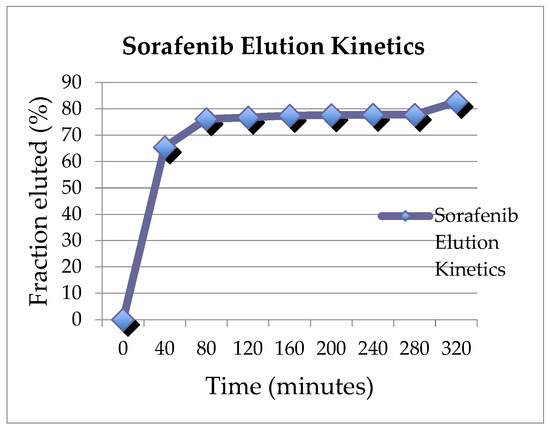 Liposomal formulations have been developed for drug delivery in clinical settings [24]. Reagents were used to prepare a cationic liposomal formulation of sorafenib and regorafenib that could be loaded onto commercially available, negatively charged embolics (DEEs). This process was awarded a US patent protection as a platform for drug delivery into solid organ tumors in 2023. Briefly a tyrosine kinase inhibitor, such as sorafenib para-toluene sulfonate salt, 1,2-dioleoyl-3- trimethylammonium-propane chloride salt (DOTAP), or 1,2-dioleoyl-sn- glycero-3-phosphocholine (DOPC), was dissolved in dehydrated ethanol. The solution was added dropwise to a 10% trehalose solution while stirring. The resulting emulsion was stirred at room temperature for an additional 5 min and filtered through a manual liposomal extruder using a 200 nm polycarbonate membrane. The unilamellar liposomal solution was lyophilized overnight. The liposomal formulated tyrosine kinase inhibitor was mixed with distilled water. Drug-eluting embolics were drained out of the fluid, leaving 2 mL of beads which were added to the liposomal formulated sorafenib or regorafenib. The loading and elution profiles were examined in vitro. Although beyond the scope of this manuscript, the range of loading efficiencies, which depended on conditions tested, varied between 41 and 51.9%. The elution profiles are shown in Figure 1 and Figure 2. At 320 min, 82.6% of sorafenib and 74.2% of regorafenib had eluted off of the beads.