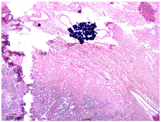 H&E stain at 100× magnification showing coagulative necrosis of the tumor associated with beads observed in the arterial lumen.