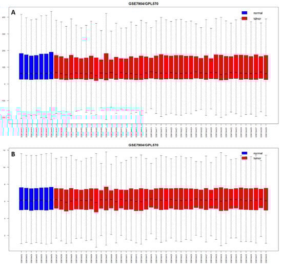 Boxplot showing the expression distribution for dataset GSE7904. (A) Raw (un-normalized) expression distribution with log2 scale in the range of −200 to 400. (B) Normalized intensities showing almost similar distributions of expression intensities, with the log2 scale in the range of 0 to 12.