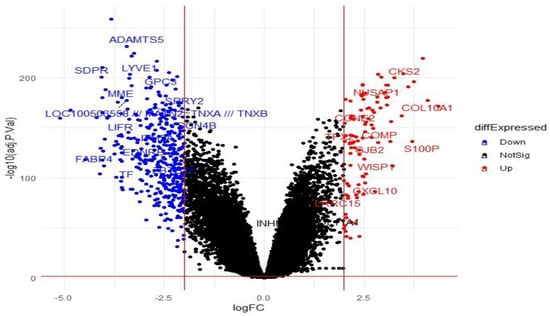 Volcano plot showing differentially expressed genes: (i) the majority were non-significant (black), (ii) upregulated DEGs (red), and (iii) downregulated DEGs (blue).