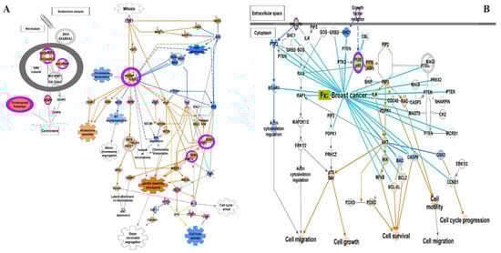 Canonical pathways derived using the IPA tool. (A) Kinetochore metaphase signaling pathway, (B) PTEN pathway overlapped with breast cancer associated genes.