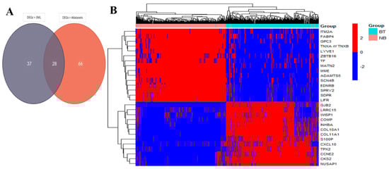 (A) Venn diagram showing 28 hub genes derived from the intersection of DEGs > 3 ML and DEGs > 4 datasets. (B) Unsupervised hierarchical clustering: heatmap of 701 samples, including 356 breast tumor (BT, cyan) and 345 normal breast (NB, pink) tissues, showing the gene expression pattern of 28 hub genes, including diagnostic and prognostic gene signatures. Upregulated genes are shown in red and downregulated genes are in blue.