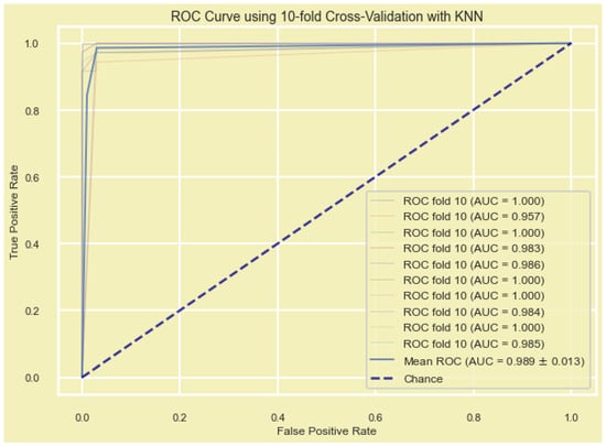 K-nearest neighbors (KNN)-based ML model for diagnostic gene signature showing the mean ROC (AUC 0.989 ± 0.013).