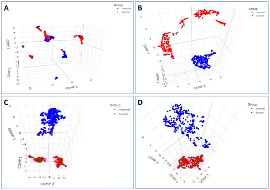 PCA plot showing an overall distribution of the samples (n = 701), including breast tumor (blue) and normal breast tissue (red) based on transcriptomics profiles: (A) 54,675 probes, (B) 355 DEGs, (C) 28 hub genes, and (D) diagnostic nine-gene signature.