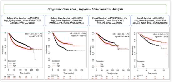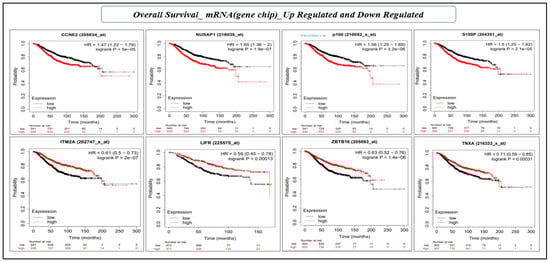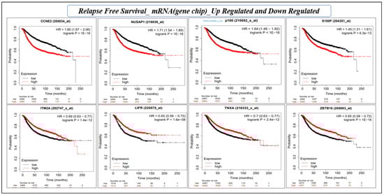 Survival analysis using the KM estimator was conducted for 28 hub genes. First, relapse-free survival and overall survival analyses were performed for mRNA (gene-chip), followed by the overall survival for mRNA (RNA seq). We identified a novel prognostic gene signature of eight genes (CCNE2, NUSAP1, TPX2, S100P, ITM2A, LIFR, TNXA, and ZBTB16) that were significant (log-rank p-value < 0.05) under both RFS and OS conditions (Table 5 and Table 6, and Figure 7 and Figure 8). The hazard ratio (HR) compares the risk of death (overall survival) and postoperative follow-up (relapse-free survival) occurring between the high and low expressions of the gene. The HR value < 1 or >1 indicates that the risks associated with a lower expression and higher expression of the gene are significantly different. On the other hand, the confidence intervals (CI) indicate the level of uncertainty around the estimated survival probability at each time point. A narrower confidence interval indicates that the survival estimate is more precise and that the sample size is large enough to produce reliable results. The CI value demonstrates the precision and reliability of the results. Finally, the log-rank p-value measures the statistical significance that helps determine whether the observed difference in survival between the groups (high and low expression of the gene) is statistically significant (<0.05), i.e., unlikely to have occurred by chance. Therefore, log-rank p-values are the deciding factors for survival significance.