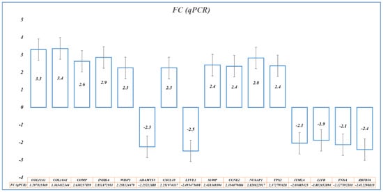 Functional analysis based on the Z-score and −log(p-value) indicated activation of the kinetochore metaphase signaling pathway (2.71, 7.35), PTEN pathway (2.64, 2.31), HOTAIR regulatory pathway (2.12, 2.71), and WNT/β-catenin signaling pathway (2.45, 1.47), and suppression of the senescence pathway (−3.16, 3.02), phagosome formation (−3.15, 2.09), FAK signaling (−3.128, 1.74), oxytocin signaling pathway (−3.05, 3.8), and breast cancer regulation by Stathmin1 (−3.0, 2.06) (Figure 3). Most significantly enriched molecular processes were the extracellular matrix, cell division, mitotic cell cycle process, cell migration, and the regulation of cell proliferation (Table 3).