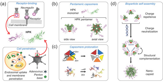 The cargo-loading deca-lysine, or K10, domain of HPK allows for binding to an anionic payload by electrostatic interaction [18] (Figure 3d) while the structure of HPK capsomeres enables a unique mode of self-multimerization into bioparticle complexes. Specifically, the formation of capsomeres aligns the K10 domains of each monomer on the same façade of the capsomere barrel (Figure 3b), creating a highly charged cationic surface for repelling other HPK capsomeres in the solution while attracting anionic molecules [23]. Binding with anionic cargo such as small nucleic acids neutralizes the cationic façade of the capsomere barrel, allowing HPK capsomeres to converge around the cargo (Figure 3d). This convergence allows capsomeres to come into close molecular contact, enabling inter-capsomere motifs inherent to the penton base [23] to interact and fit together by shape complementarity (Figure 3d). This complementation combined with the cork-shaped structure imposed by the penton base nucleates the formation of a spherical polyhedron with the anionic cargo encapsulated by the protein shell (Figure 3d). Self-assembly of HPK capsomeres with either small nucleic acids, drug-intercalated nucleic acids, or small molecules forms similar-sized complexes of 20–40 nm in diameter whereby the HPK protein surrounds and encapsidates the cargo [22,23]. Functional studies have shown that this encapsulation enables protection of cargo from nucleases while sustaining stability in blood and serum [23]. On the other hand, the high stability afforded by the polyhedral stacking of protein may limit the efficacy to which cargo may be released. Although in silico and functional studies conducted in varying pH conditions [23] indirectly suggest that cargo release may be mediated in part by entry into the endosomolytic environment, the extent to which this occurs remains to be determined.