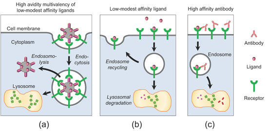 Multivalency and receptor binding. (a) Schematic representing multivalent binding of HPK bioparticle to multiple HER3 receptors, inducing endocytosis followed by evasion of lysosomal degradation through endosomal escape. (b) Schematic showing ligand–receptor interactions that may lead to the endolysosomal degradation pathway or recycling pathway. (c) Schematic of antibody-receptor binding suggesting that antibody internalization may be dependent on ligand-mediated co-uptake.