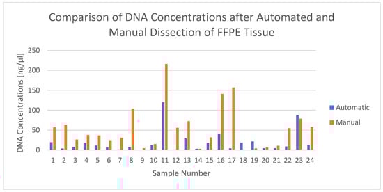 Comparison of DNA concentrations after automated and manual dissection of FFPE tissue. Concentrations in ng/µL are depicted on the y-axis, investigated sample numbers on the x-axis. Blue bars resemble the concentrations after the automatic dissection process, whereas orange bars display the concentrations of the manual procedure. Of all 24 samples, only samples 18, 19 and 23 showed a higher concentration after the automated dissection as compared to the manual approach.