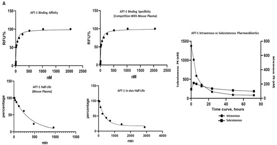RNA aptamers represent a novel category of therapeutic agents [8,9,17]. They are 12–80 nt ss RNA oligonucleotides with stable three-dimensional conformations that tightly and specifically bind to their target proteins. RNA aptamers bind to extracellular targets, such as the soluble Adam8 metalloproteinase domain. As demonstrated by Apt-1 and OPN-R3, these RNA aptamers typically exhibit binding affinities in the low nanomolar to picomolar range, are heat stable, are not immunogenic, and exhibit minimal batch-to-batch variability [Figure S5]. Modifications, such as amino- or fluoro-substitutions at the 2′ position of pyrimidines, reduce the degradation of aptamers by nucleases. The biodistribution and clearance of aptamers are altered by the addition of polyethylene glycol and cholesterol. In addition, SELEX allows for selection from libraries consisting of up to 1015 ligands in order to generate high-affinity oligonucleotide ligands capable of binding to purified biochemical targets such as Adam8.