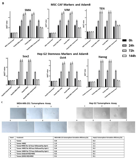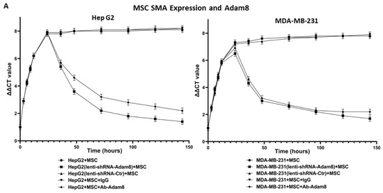 To determine the potential role of Adam8 in the cell-signaling crosstalk between MSCs and cancer cells toward the induction of the myCAF phenotype with a concomitant increase in cancer stemness, we performed coculture studies in which human MSC cells were cultured with either MDA-MB-231 breast cancer cells or HepG2 liver cancer cells and the Adam8 antibody added at different time points to block Adam8 bioactivity. In selected instances, MSCs were cultured with MDA-MB-231 (Adam8-KD) or HepG2 (Adam8-KD), and in others, Adam8 mAb was added (Figure 2A). After coculturing for periods of up to 144 h, MSC α-SMA expression was measured via real-time PCR as a reflection of the myofibroblast myCAF phenotype (MDA-MB-231 alone or HepG2 alone were used as reference samples). In all instances, the coincubation of cancer cells with MSCs resulted in increased α-SMA expression with a plateau at 30 h, except in the presence of Adam8 mAb or lentivirus Adam8 KO, in which there was a progressive decline in α-SMA expression starting at approx. 30 h and ranging to a level 1.5–2-fold greater than the baseline. We also determined the HepG2 and MDA-MB-231 expression of the cancer stemness markers sox2 and Oct4 in the coculture models (Figure 2B,C). In a manner similar to that presented for α-SMA, the cancer cell expression of both stemness markers increased with a plateau at 30 h, except in instances wherein Adam8 mAb or lentivirus Adam8 KO were present. These results indicate that Adam8 is required for the maintenance of the myCAF and cancer stemness phenotype in these coculture models.