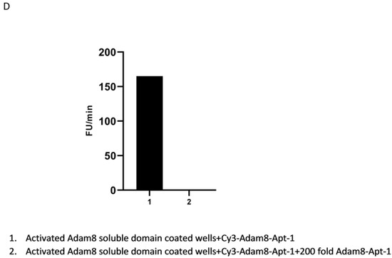 Binding affinity assays: Ni-NTA-coated 96-well plates were coated with activated recombinant human Adam8 soluble domain his-tag protein. Cy3-labeled Adam8 aptamers were synthesized via IDT (Integrated DNA Technologies, Coralville, IA, USA). Cy3-Adam8 aptamers were added to the Adam8-Ni-NTA plates at different concentrations in PBS solution at room temperature for 30 min, washed 3 times with PBS, and quantified with Cytation 1 (BioTek, Santa Clara, CA, USA) [12]