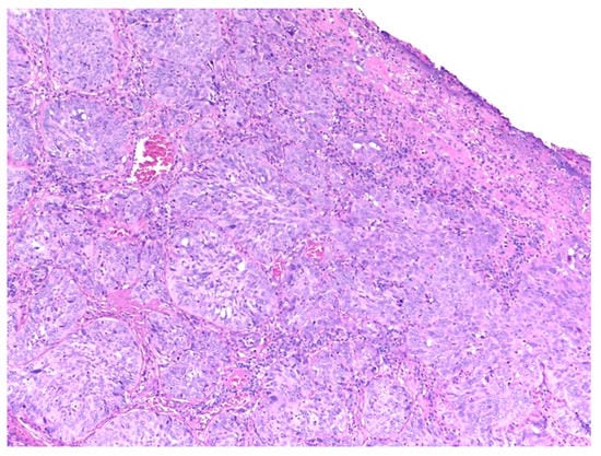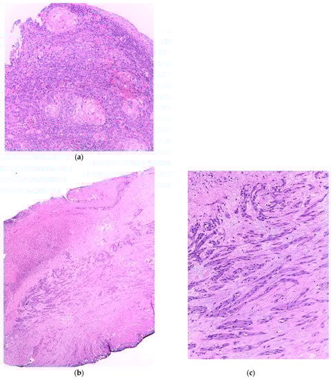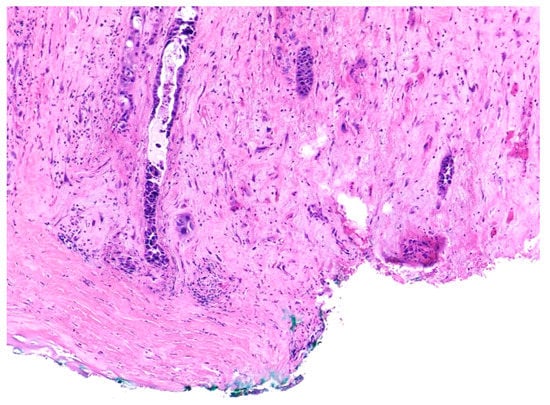 A constant delayed tissue change of radiotherapy is subepithelial fibrosis, which consists of areas of dense acellular or paucicellular collagen with variable extension and severity [11]. Laryngeal mucosa is expanded by dense collagen deposition, and fibrin may also be detected in the stroma in between collagen fibers and fibroblasts [10]. In their study of 20 irradiated vocal folds from 13 patients, Berg et al. found increased collagen and muscle fiber disorganization in the irradiated specimens as compared to the controls, together with a significant increase of hyaluronic acid and fibronectin tissue content, and a decrease of laminin [12]. This is accompanied by increased transcription of markers for fibrosis, oxidative stress, inflammation, glycosaminoglycan production, and apoptosis [13]. The mechanisms involved in the development of vocal fold fibrosis have been investigated in murine models [13,14], which show similar histologic and biochemical changes to irradiated human vocal folds. Transcriptional analysis revealed upregulated expressions of TGF-beta1, which is responsible for the fibrotic changes and induces myofibroblast differentiation, and iNOS at six months. Conversely, the expressions of Acta2, Col1a1, Col3a1, and MMP8 were downregulated, indicating reduced collagen turnover [14]. Another characteristic radiotherapy-induced delayed mesenchymal change in the upper respiratory tract is the presence of atypical fibroblasts, which can be detected in 50–60% of the cases in salvage laryngectomies [10]. They present as large cells with amphophilic/basophilic cytoplasms and large irregularly hyperchromatic nuclei with prominent nucleoli.