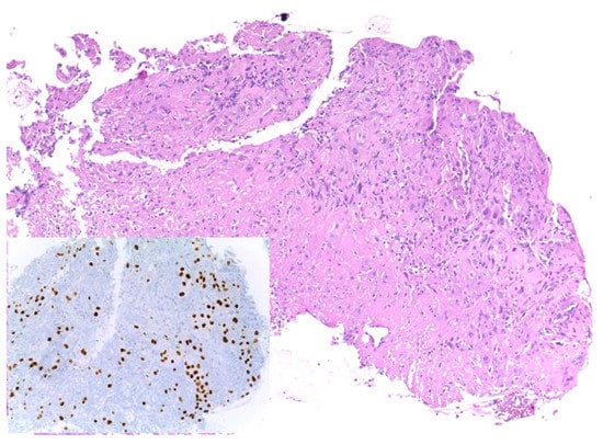 Recurrent squamous cell carcinoma of the vocal cord following radiotherapy. In this biopsy specimen, tumor cells are obscured by necrosis and fibrosis. They are highlighted by the nuclear immunohistochemical staining for P40 (inset).