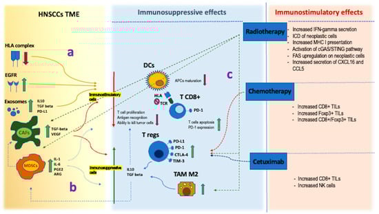 The degree of immunosuppression in posttreatment laryngeal SCC TME relies upon several factors fostering each other. SCC-related alterations of TME are responsible for a reduction of immune response by decreasing the activity of immune-stimulatory cells. Downregulation of the HLA complex impairs the process of antigen recognition by CD8+ T-cells [25]. Increase of tumor-derived exosomes alters TME toward an immunosuppressive fashion environment in many ways, including the inhibition of T-cells function and the modification of many several immunoregulatory factors such as PD-L1, IL-10, and TGF-beta [26]. EGFR is upregulated in most HNSCC, and activation of its downstream pathway hampers immune activation through several mechanisms, including downregulation of antigen presentation [27] (a). MDSCs and CAFs are typically increased in HNSCC TME, and they secrete a number of cytokines and soluble factors suppressing CD8+ T-cells, such as prostaglandins (PGE2), arginase (ARG), IL-1, IL-6, TGF-beta, and VEGF. MDSCs and CAFs exert immune suppressive roles both by decreasing the activity of immunostimulatory cells and recruiting immunosuppressive cells represented by Tregs and TAM M2. The latter produce immunosuppressive cytokines such as IL-10 and TGF-beta, which in turn further increase MDSCs within the TME and suppress T-cells functions [28,29,30,31,32] (b) T-regs are remarkably increased in TME of HNSCC and they show an upregulation of immune checkpoint molecules, namely PD-1, PD-L1, and CTLA-4 [33,34,35]. PD-1 expression is also increased on T CD8+ cells in HNSCCs [29,30]. On the other side, RT, CT, and Cetuximab are capable of both immunosuppressive and immunostimulatory effects. Radiotherapy contributes to the increase of MDSCs and CAFs, thus indirectly enforcing the immunosuppressive mechanisms described above [28]. At the same time, RT, CT, and Cetuximab increase Tregs in TME and favour the upregulation of PD-L1, PD-1, CTLA-4, and TIM-3 on the Tregs surface. Furthermore, RT recruits TAM M2, which, as already pointed out, fulfils an immunosuppressive activity [28] (c).