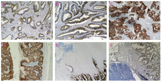- Elzagheid, A.; Algars, A.; Bendardaf, R.; Lamlum, H.; Ristamaki, R.; Collan, Y.; Syrjanen, K.; Pyrhonen, S. E-cadherin expression pattern in primary colorectal carcinomas and their metastases reflects disease outcome. World J. Gastroenterol. 2006, 12, 4304–4309. [Google Scholar] [CrossRef]