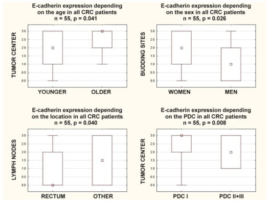 Different distributions of E-cadherin expression within colorectal cancer were observed; the highest percentage of positive E-cadherin expression was found in the invasive front and in the tumor center. Additionally, the different cellular distribution of E-cadherin expression was noticed; weak membranous E-cadherin expression was the highest in the invasive front and in the budding sites, but a strong membranous pattern was most frequent in the tumor center. Various distributions of E-cadherin expression depending on cancer progression were also found; E-cadherin expression in node-positive patients was lower in the tumor center and in the tumor invasive front, whereas, in patients with distant metastases, the expression of E-cadherin was lower in the budding sites. In tumors with lower TNM stages, with lymphoid follicles, and with some lower tumor budding parameters, E-cadherin expression was higher. E-cadherin expression was revealed to be lower at the tumor center in younger individuals, at the budding sites in men, and at the surrounding lymph nodes in rectal tumors.