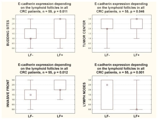 The majority of the gut-associated lymphoid tissue in the colon is composed of isolated lymphoid follicles dispersed throughout the large intestines. These lymphoid follicles have a diameter of 0.1–0.7 mm and consist of a specialized epithelium that overlies a subepithelial copula containing numerous macrophages, dendritic cells, lymphocytes, and antigen-sampling cells [21]. In our study, E-cadherin expression in all locations inside the primary tumor (invasive front, tumor center, budding sites) was higher, and in regional lymph nodes, it was lower in CRCs with lymphoid follicles; this is the first observation of this kind and seems to broaden our understanding of CRC biology. Some authors have previously shown that lymphoid follicles have immune-mediated anti-tumor effects [21]. Others have suggested that lymphoid follicles in early colorectal tumors are signs of an early physical defense event against cancer cells [22]. In our recent study, we found that the presence of lymphoid follicles positively correlated with the density of some tumor-infiltrating immune cells (lymphocytes CD8 and tumor-associated neutrophils) in the tumor center and with the density of some tumor-infiltrating immune cells (lymphocytes CD8) in the invasive front [9]. Moreover, we found that a high lymphoid follicles density was observed in cases of low-advanced cancer according to the TNM stage; it appears that lymphoid follicles may reflect the host’s defense against cancer and be an indicator of a favorable prognosis [9].