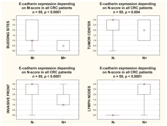Box plots representing the association of membranous E-Cadherin expression according to N and M categories in CRC patients. The small square shows the median, the large rectangles demonstrate the 25–75% confidence interval, and the whiskers represent the minimum and maximum values.