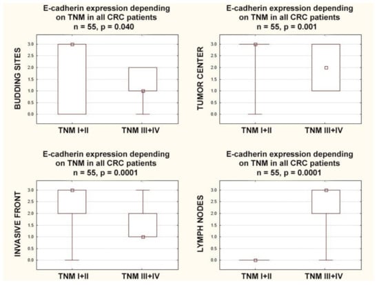 In patients with higher stages (TNM-III+IV), E-cadherin expression was lower in the budding sites (p = 0.040), in the tumor center (p = 0.001), and in the invasive front (p = 0.0001). Additionally in patients with higher stages (TNM-III+IV), E-cadherin expression in the lymph nodes was (inversely) higher than in the lower stages (TNM-I+II) (p = 0.0001) (Figure 5).