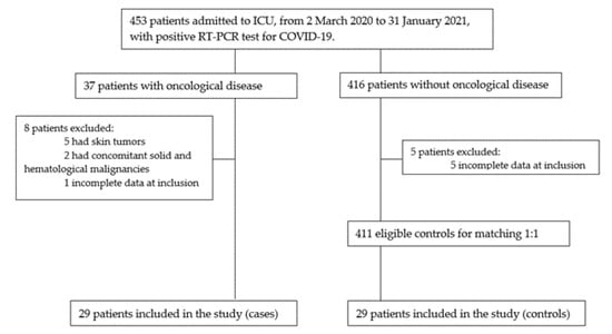 We included all patients admitted to the ICU in this period that were at least 18 years old and had an oncological disease (solid or hematological) diagnosed prior to hospital admission; patients with skin tumors as well as those with concomitant solid and hematological malignancies were excluded. This group (case group) was matched 1:1 on age, sex and underlying comorbidities with COVID-19 non-cancer patients (control group) admitted to the ICU of CHUPorto in the same period (Figure 1).