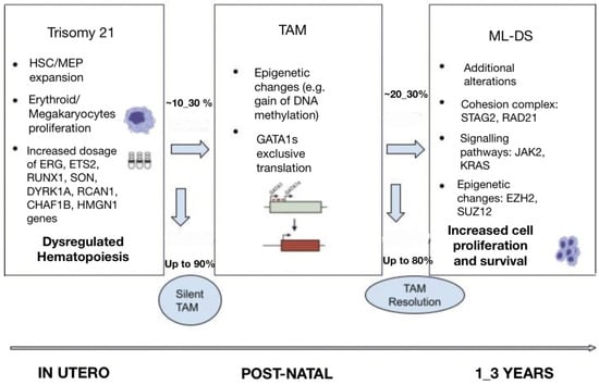 It is well established that gains and losses of entire chromosomes or specific genomic regions are hallmarks of cancer. Neonates with gain of chromosome 21 are considered to be more frequently susceptible to hematological malignancies. Constitutive trisomy 21 results in altered hematopoiesis and dysregulated development of the megakaryocytic, erythroid and B-cell lineages [6]. Several studies from genetically engineered models have shown perturbed fetal hematopoiesis in DS individuals and have allowed for the identification of chromosome 21 dosage-sensitive genes [15]. It has been revealed that there is an increased proportion of hematopoietic stem cells (HSCs) and megakaryocyte–erythroid progenitors (MEP) in trisomy 21 fetal livers, which in cooperation with GATA1s expression, results in promoting blast and megakaryocyte expansion [15]. Moreover, studies have established fetal hematopoiesis from trisomic DS-derived induced pluripotent stem cells (iPSCs), which lead to significant expansion of myeloid and megakaryocytic progenitors compared with disomic cells [15]. More importantly, GATA1s expression correlates with defective embryonic hematopoiesis with a strong bias toward the myelo-megakaryocytic compartment and results in the development of TAM during fetal life [14].