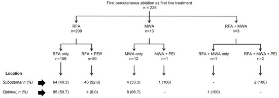 - Sala, M.; Llovet, J.M.; Vilana, R.; Bianchi, L.; Solé, M.; Ayuso, C.; Brú, C.; Bruix, J. Barcelona Cly’nic Liver Cancer (BCLC) Group. Initial response to percutaneous ablation predicts survival in patients with hepatocellular carcinoma. Hepatology 2004, 40, 1352–1360. [Google Scholar] [CrossRef]
