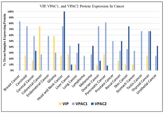 Protein expression of VIP and VIP Receptors In Cancer: VIP expression is highest in gliomas and colorectal, pancreas, thyroid cancers. VPAC1 is generally expressed on all cancer types and VPAC2 expression is limited to certain cancer types including those of the head and neck, lung, skin, kidney, thyroid, bladder, and melanoma.