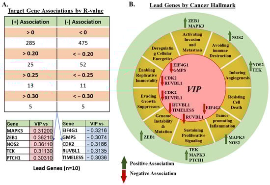 10 Lead Genes Identified and Associated Cancer Hallmarks: (A) 10 lead-genes identified with R values > |0.3| for the entire analyzed dataset. (B) Further analysis by cancer hallmark shows potential associations of VIP with hallmarks other than proliferative signaling.