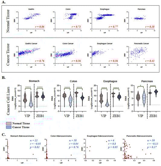 Given the compelling association between VIP and ZEB1 identified in gastrointestinal malignancies, especially of the stomach and colon, we tested VIP and ZEB1 expression in their corresponding healthy tissues. The healthy gastrointestinal tissue expression of VIP and ZEB1 was analyzed using the GTEX dataset []. Healthy gastric, colon, esophageal, and pancreatic tissues had R coefficients between VIP and ZEB1, an expression similar to those seen in TCGA cancer tissues (p < 0.0001 for all analyses) (Figure 4A). The biphasic distribution of VIP/ZEB1 (low) vs. VIP/ZEB1 (high) seen in the colon and esophageal tissues is thought to be related to the differences in the presence of mucosal and submucosal tissue in the samples. VIP expression in healthy pancreatic tissue is likely more susceptible to hormonal regulation of the endocrine pancreatic tissue, supporting the findings of variable VIP expression with somewhat consistent ZEB1 expression.