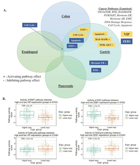VIP and ZEB1 Expression and Cancer Pathway Activity: Gene set analysis was performed to assess the pathway activity of VIP and ZEB1 in gastrointestinal malignancies, including COAD (colon adenocarcinoma), ESCA (esophageal carcinoma), PAAD (pancreatic adenocarcinoma), and STAD (stomach adenocarcinoma). The analysis was conducted using the GSCA (Gene Set Cancer Analysis) tool, as previously described [], with pathway activity scores assigned in ten critical cancer-related pathways (TSC/mTOR, RTK, RAS/MAPK, PI3K/AKT, hormone ER, hormone AR, EMT, DNA damage response, cell cycle, and apoptosis) based on a total of 7876 TCGA samples across 32 different cancer types. Pathway activity was determined by stratifying samples into high and low-expression groups based on the median gene expression, and a score was then calculated using a student t-test, with p-values adjusted by the false discovery rate (FDR). Reported results were considered significant when the FDR was <0.05, indicating a low likelihood of false positives.