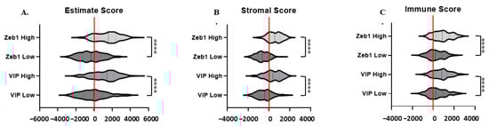 VIP is also known to exert paracrine effects in cancer by supporting the immunosuppressive activity of CD4+CD25+ regulatory T cells and tolerogenic dendritic cells [,]. In vivo studies have demonstrated that treatment with VPAC peptide antagonists can reverse these immune effects and down-regulate T cell expression of the inhibitory marker PD-1, promote cytotoxic T cell differentiation and expansion, and enhance intratumoral T cell infiltration, ultimately leading to tumor elimination [,,,], and we have recently shown that inhibiting VIP in murine pancreatic cancer models improves the response to T cell checkpoint inhibitors []. To determine if the VIP and ZEB1 associations seen in our analysis were confounded by immune cell-mediated paracrine VIP, we compared whether high versus low VIP and ZEB1 expression correlated with tumor purity, stromal tissue presence, or immune cell infiltration using the estimate, stromal, and immune scores, respectively. ZEB1 and VIP high-expressing tumors (n = 189) were associated with higher median estimate and stromal scores, with high expression most associated with positive scores (Figure 6A,B). Median immune scores were positive for low and high ZEB1 and VIP expression, with higher scores associated with increased VIP and ZEB1 expression (Figure 6C).