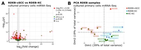 (A) Volcano plot shows differentially expressed miRNAs in RDEB−cSCC compared to RDEB−KC (FC: fold change, p: Wald test for significance DESeq2, n.s.: non-significant p > 0.05). (B) PCA plot indicates that the RDEB−cSCC-specific miRNA expression profile enables their separation from RDEB−KC and HC−KC samples.