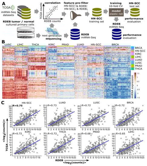 Similarity between RDEB−cSCC and solid TCGA tumors. (A) Data analysis workflow. TCGA miRNA−Seq tumor datasets were correlated with RDEB−cSCC sequencing data from cultured primary cells to identify tumor types with miRNA expression patterns similar to RDEB−cSCC. The most similar TCGA data is randomly split and a part of it is used—after applying a feature pre-filter by selecting concordantly regulated miRNAs when comparing expression in HN-SCC and RDEB samples—to train an elastic net logistic regression model, its performance is subsequently evaluated on independent TCGA and RDEB test sets. (B) Heatmap of miRNA expression levels (rows) of tumor samples (columns) from eight different TCGA tumor types shows distinct and tumor type associated expression patterns (red indicates an increased and blue a decreased miRNA expression, normalized and z-transformed read counts). (C) Scatterplots of mean log2 normalized (DEseq2) miRNA-Seq counts (each dot represents one miRNA) of TCGA tumor and RDEB−cSCC samples. (R spearman rank correlation, p < 2.2 × 10−16 for all 8 comparisons). (BRCA: breast invasive carcinoma, KIRC: Kidney renal clear cell carcinoma, LUAD: lung adenocarcinoma, LIHC: liver hepatocellular carcinoma, LUSC: lung squamous-cell carcinoma, PRAD: prostate adenocarcinoma and THCA: Thyroid carcinoma).