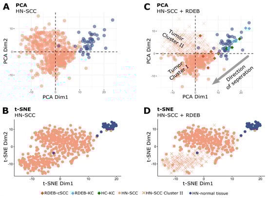 Multivariate analysis of HN−SCC. (A) PCA plot of the first two principal components of normalized (DESeq2) miRNA-Seq data of TCGA/HN−SCC shows a distinct cluster for normal tissue samples, as well as two tumor clusters (each dot represents one sample). (B) t−SNE plot of HN−SCC data also presents three distinct clusters. (C) Plot shows RDEB samples projected into HN−SCC PCA space with separation of RDEB−cSCC from RDEB−KC and HC−KC samples along the direction of a separation of HN−SCC tumor cluster I and HN-normal tissue samples (x: HN−SCC tumor cluster II samples). (D) HN−SCC samples from tumor cluster II (PCA plot) are associated with one of the two distinct tumor clusters in the t−SNE plot.