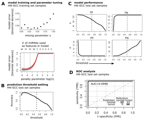 MiRNAs that are present in all used datasets were filtered to pre-select 66 out of 254 detected miRNAs, based on at least 20% concordant (RDEB-cSCC and HN-SCC) deregulation in tumor versus normal samples (p-value < 0.1, Student t-test on normalized data). The HN-SCC data (n = 277 tumor from cluster I and n = 44 normal tissue samples) were equally split into two sets by random sampling and labelled as training and test set. Further, the tumor set was downsampled to obtain a balanced training set with equal numbers of tumor (n = 22) and normal tissue (n = 22) samples. The representativity of the balanced training subset was evaluated based on available clinical data including gender, age, anatomic subsite and pathologic stage as well as common risk factors such as smoking, showing that there was no significant difference in cluster I tumor samples (Supplementary Materials file: Table S1). For training of the prediction model, Elnet provides the option of applying a mix of feature (miRNA) selection by least absolute shrinkage and selection operator (lasso, L1 norm of used coefficients), and ridge penalization (L2 norm of used coefficients, Equation (1)) [32]. In order to tune the model’s mixing parameter α (Equation (1)) as well as the penalty parameter λ (Equation (2)) and thereby find an optimal bias-variance trade off, a five-fold cross validation (cv.glmnet function in R) was performed on the balanced HN-SCC training dataset to minimize the model error (deviance, Figure 4A) [42]. The cross-validation process determined an optimal mixing parameter (αopt = 0.3) which conducts 30% lasso and 70% ridge regression, and controls for highly correlated miRNAs as well as further reduces the amount of miRNAs used in the model. The optimal penalty parameter λopt = 0.0606 was found at λmin + one standard deviation. Finally, the Elnet model was fit (glmnet function in R) to the HN-SCC training data. The lasso regularization selected 33 miRNAs (SIG-33 model) with non-zero regression coefficients from the initial 66 features.