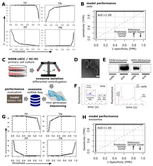 SIG-33 model performance in cultured cells and exosomes. (A) Elnet model was tested on cell-based RDEB miRNA-Seq data including RDEB-cSCC (n = 6), HC (n = 4)/RDEB-KC (n = 5) (n: amount of samples classified as either: TP: true positive, TN: true negative, FP: false positive, FN: false negative compared to the labeled reference, dashed line represents default threshold set to 0.5 and bold lines: interpolation between point estimates). (B) ROC curve illustrates the model’s predictive performance on RDEB-cSCC data. Inset summarizes the prediction results at threshold set to default 0.5. (TPR: true positive rate, FPR: false positive rate, AUC: area under curve, bold line: empirical ROC curve and dashed: chance line). (C) Workflow for generation of exosomal miRNA-Seq data. (D) TEM of exosomes isolated from conditioned medium of cultured primary cells (scale bar: 50 nm). (E) Western blot bands show positive signal for exosome marker CD9 and negative signal for impurity related Golgi marker GM130 in exosomal protein lysates (RDEB-SCC1), whole-cell lysates (RDEB-SCC1) were used as control (complete Western blot image is shown in Supplementary Materials file: Figure S2). (F) Electropherograms show characteristic profiles for RNA isolated from exosomes ((left panel), low to non-existent 18S/29S rRNA peaks, see insets) as well as RNA extracts from whole cells (right panel). (G,H) Threshold and ROC plots: Elnet model tested on sequencing data generated from exosomal miRNAs including RDEB-cSCC (n = 7), HC (n = 5)/RDEB (n = 1)-KC.