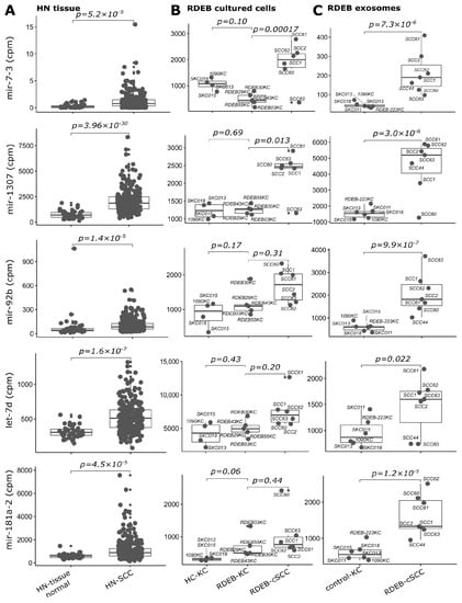 SIG-10 miRNAs up-regulated in tumors. Boxplots illustrate sequencing counts normalized by library size (mapped reads, cpm: counts per million) of five miRNAs used in the prediction model, which show concordant up-regulation in (A) HN tissue: HN-SCC (cluster I, test set), (B) RDEB cultured cells: n = 6 RDEB-cSCC, n = 5 RDEB-KC and n = 4 HC-KC) and (C) RDEB exosomes: n = 7 RDEB-cSCC, n = 1 RDEB-KC and n = 5 HC-KC data, compared to respective controls (HN tissue: non-tumor tissue samples, RDEB cultured cells: HC/RDEB-KC samples grouped separately and RDEB exosomes: combined HC/RDEB-KC samples). (p-value: significance, DESeq2 Wald test, Benjamini & Hochberg multiple testing adjusted). Each dot represents one sample, small dots indicate outliers. For exosomes, RDEB- and HC-KCs were combined into “control-KC” group.