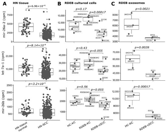 SIG-10 miRNAs down-regulated in tumors. Boxplots illustrate sequencing counts normalized by library size (mapped reads, cpm: counts per million) of three miRNAs (let-7a-1 is representative for paralogues let-7a-2 and let-7a-3) used in the prediction model, which show concordant down-regulation in (A) HN tissue: HN-SCC (cluster I, test set), (B) RDEB cultured cells: n = 6 RDEB-cSCC, n = 5 RDEB-KC, n = 4 HC-KC) and (C) RDEB exosomes: n = 7 RDEB-cSCC, n = 1 RDEB-KC, n = 5 HC-KC data, compared to respective controls (HN tissue: non-tumor tissue samples, RDEB cultured cells: HC/RDEB-KC samples grouped separately, RDEB exosomes: combined HC/RDEB-KC samples). (p-value: significance, DESeq2 Wald test, Benjamini & Hochberg multiple testing adjusted). Each dot represents one sample, small dots indicate outliers. For exosomes, RDEB- and HC-KCs were combined into “control-KC” group.