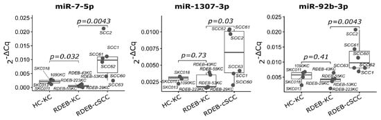 Interestingly, in our analysis, it turned out that a certain heterogeneity in miRNA expression existed within the HN-SCC group, and a subset of samples (cluster I) appeared more like RDEB-cSCCs. The major difference between HN-SCC clusters I and II could be attributed to distinct patterns in miRNA expression with a characteristic signature of miRNAs (Supplementary Materials file: Figure S1) that have previously been shown to be related to HPV infection in cervical and HN-SCCs [55,56]. In the context of RDEB, the HPV status of patients has been assessed by Purdie et al., who showed that HPV infection is uncommon in RDEB, and also cell lines analyzed in our lab tested negative [57]. Still, a commonality between HN-SCC patients with HPV and individuals living with RDEB is an enrichment in certain mutational signatures, particularly APOBEC [9,58]. However, whether the presence of APOBEC mutational signatures in both RDEB-SCCs and HPV-positive HN-SCCs is linked to the observed similarities in differential miRNA expression is speculative and remains to be investigated.