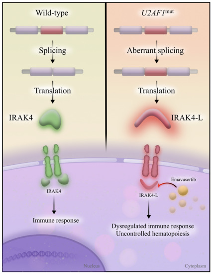 - Smith, M.A.; Choudhary, G.S.; Pellagatti, A.; Choi, K.; Bolanos, L.C.; Bhagat, T.D.; Gordon-Mitchell, S.; Von Ahrens, D.; Pradhan, K.; Steeples, V.; et al. U2AF1 mutations induce oncogenic IRAK4 isoforms and activate innate immune pathways in myeloid malignancies. Nat. Cell Biol. 2019, 21, 640–650. [Google Scholar] [CrossRef]