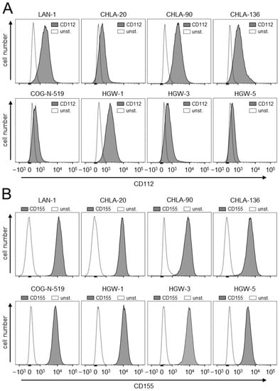 Firstly, we analyzed the human NB cell lines LAN-1, CHLA-20, CHLA-90, CHLA-136 and COG-N-519 for the basal expression of the two TIGIT ligands, CD112 and CD155, by flow cytometry. Additionally, we assessed CD112 and CD155 on the in-house-established cell lines that originated from the tumor samples of high-risk NB patients (HGW-1, HGW-3 and HGW-5) [14].