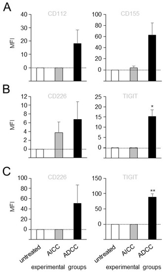 Figure 2. Impact of ADCC, mediated by DB, on expression of TIGIT and CD226 on effector cells, as well as CD112 and CD155 on tumor cells. (A) Effects of ADCC, mediated by DB, on expression levels of CD112 and CD155 on NB cells were assessed using flow cytometry. ADCC was induced by incubation of the GD2 expressing NB cells LAN-1 with leukocytes of different healthy donors and DB. Untreated NB cells (untreated) and NB cells incubated with effector cells without DB (AICC) served as controls. Effects of ADCC mediated by DB on expression levels of CD226 and TIGIT on leukocytes (B) and NK cells (C). Data are presented as a difference of gMFI (MFI), that was calculated according to the formula: experimental gMFI—gMFI of untreated controls. Data are shown as mean values ± SEM of at least 3 independent experiments. t-test; * p < 0.05 vs. untreated and AICC, ** p < 0.01 vs. untreated and AICC.