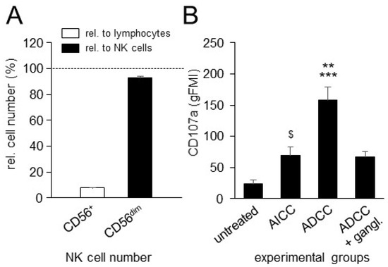 Figure 3. Analysis of NK-cell numbers in the samples used and impact of ADCC mediated by DB on NK-cell activity. (A) Analysis of NK-cell numbers and numbers of CD56dim NK cells in the effector cell samples used was performed by flow cytometry. Data are presented in % as numbers of all NK cells (white column) and CD56dim NK cells (black column), relative to all lymphocytes and all NK cells found in the samples used, respectively. (B) Impact of ADCC mediated by DB on expression of CD107a. ADCC was induced by incubation of the GD2-expressing NB cells LAN-1 with leukocytes of healthy donors and DB. Untreated NB cells (untreated) and NB cells incubated with effector cells without DB (AICC) served as controls. Data are shown as mean values ± SEM of at least 3 independent experiments. t-test; $ p < 0.05 vs. untreated, *** p < 0.001 vs. untreated, ** p < 0.01 vs. AICC.
