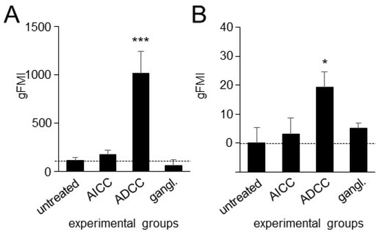 In line with our previous observations showing the DB-ADCC-mediated induction of the immune checkpoint PD-1/PD-L1 [6], the incubation of tumor cells with effector cells and DB (ADCC) resulted in a strong increase in PD-L1 on tumor cells (Figure 4A) and PD-1 on NK cells (Figure 4B). The GD2 specificity of the observed effects was confirmed by the additional incubation with the anti-idiotype Ab ganglidiomab. Here, the ADCC-dependent induction of both the receptor PD-1 on NK cells, and its ligand PD-L1 on tumor cells, was completely abrogated showing similar cytotoxicity levels compared to the controls (untreated and AICC).