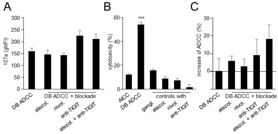 Figure 5. Effects of TIGIT blockade in combination with blockade of the PD-1/PD-L1 pathway on NK-cell activity and ADCC mediated by DB. (A) Effects of DB-ADCC in combination with immune checkpoint blockade on NK-cell activity were assessed by flow cytometry analysis of CD107a. ADCC was induced by incubation of the GD2-expressing NB cells LAN-1 with effector cells and DB. Blockade of PD-L1, PD-1 and TIGIT was performed using the anti-PD-L1 Ab nivolumab (nivol.), anti-PD-1 Ab atezolizumab (atezol.) and anti-TIGIT Ab (anti-TIGIT), respectively. (B) Effects of therapeutic Ab on cytotoxic activity of effector cells against NB cells. NB cells incubated with effector cells without Ab (AICC) served as controls. NB cells and effector cells incubated with DB (DB-ADCC), atezolizumab (atezol.), nivolumab (nivol.) or anti-TIGIT Ab (anti-TIGIT). To confirm the GD2 specificity of DB-ADCC, tumor and effector cells were incubated with DB in combination with the anti-idiotype Ab ganglidiomab (gangl.). (C) Effects of immune checkpoint blockade on ADCC mediated by DB. Data are presented in % as difference between the experimental cytotoxicity and DB-ADCC. Solid line indicates differences between experimental groups and DB-ADCC. Data are shown as mean values ± SEM of at least 3 independent experiments. (B) ANOVA; *** p < 0.001 vs. AICC.