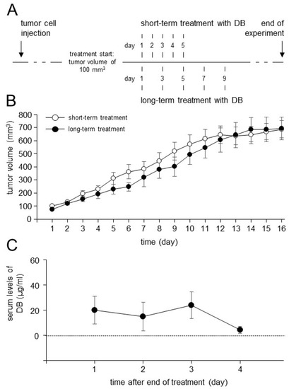 Figure 6. Schematic overview of the short- and long-term treatment protocols and analysis of tumor growth and DB serum concentrations. (A) Schematic overview of the short- and long-term treatment protocols. Mice were treated with DB either every day for five days (short-term treatment) or every second day for ten days (long-term treatment). When tumors developed a tumor size of 100 mm3, treatment was started. (B) Analysis of tumor growth in mice treated with DB given either every day for five days (short-term treatment; open circles) or every second day for ten days (long-term treatment; closed circles). Tumor growth was determined daily. When mice were sacrificed ahead of schedule due to tumor burden, the last measurement was included in the calculation of tumor growth at subsequent time points. Data are given as mean + SEM. (C) Serum levels of DB in mice treated with DB every second day for ten days (long-term treatment). Samples collected on days 1, 2, 3 and 4 after the end of DB treatment were assessed with ELISA as described in the Section 2. Data are given as mean + SEM.