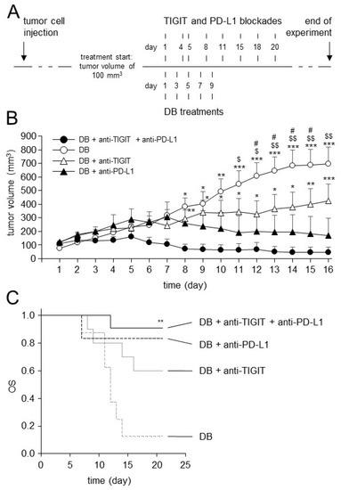 After the successful establishment of the long-term DB treatment protocol, we used it for the evaluation of the antitumor efficacy of DB immunotherapy combined with the double blockade of TIGIT and PD-L1. We started to treat mice showing tumors of approximately 100 mm3 volume, as depicted in Figure 7. Mice receiving a monotherapy with DB, or DB in combination with either anti-TIGT or anti-PD-L1 Ab, served as controls.